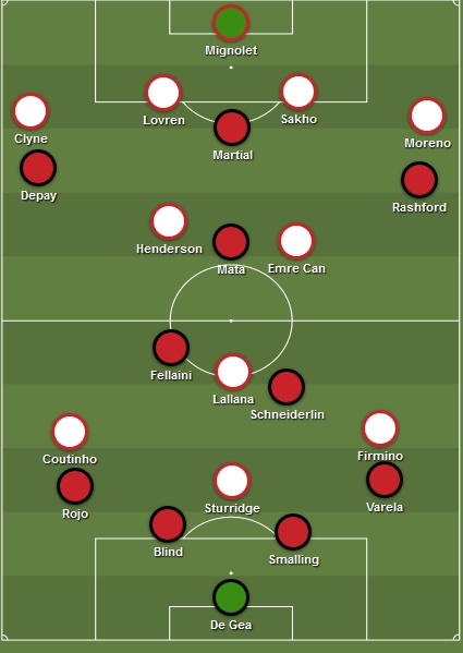 Van Gaal incluyó a Rashford por la banda derecha, dejando el centro del ataque a la velocidad de Martial, que se presumía, por velocidad podía lastimar a una dupla de centrales compuesta por Lovren y Sakho. No obstante, Liverpool siempre fue quien tomó la iniciativa. Manchester se replegó en su campo, y los locales comenzaron a jugar en campo rival, con sus defensores centrales avanzando con pelota dominada, ya que la presión del United no comenzó ni siquiera una vez que llegaban a mitad de cancha. El jugar tan cerca de su área, trajo consecuencias para los "Red Devils": tras un pase en profundidad hacia la banda derecha, Depay tuvo que cerrar al lateral Clyne, cuando en realidad, debería ser al revés. No pareció infracción, pero el árbitro compró la caída y Sturridge, con suspenso, venció a De Gea para poner el 1-0. Tampoco el estar en desventaja despertó al Unietd, que cuando intentó presionar lo hizo con muchísimos errores: de forma individual, desordenada y descompensada. La defensa no adelantaba metros y el espacio con el mediocampo era bien aprovechado por los jugadores ofensivos del Liverpool, que jugaron un partidazo. La movilidad de Coutinho, Lallana, Firmino y Sturridge fue brillante y constante. Así los espacios se creaban y siempre daban lugar a la subida de los laterales o la inserción en la jugada de los mediocentros más retrasados, Emre Can y Henderson.